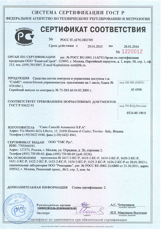 Наш магазин является официальным дистрибьютором группы компаний CAME и DoorHan, что подтверждается соответствующими сертификатами.