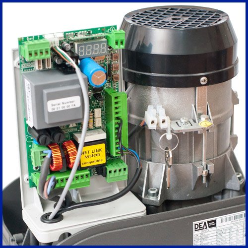 Электропривод для промышленных и тяжёлых бытовых откатных ворот DEA REV 220/M. Для ворот массой до 1400 кг. Напряжение питания 230В; напряжение питания двигателя 230В; класс защиты IP44; диапазон рабочих температур от -20°С до +50°С; тип привода электромеханический. Интенсивность использования: до 27 циклов в час. Блок управления NET 230N со встроенным энкодером (датчик, определяющий положение ворот). С магнитными концевиками!